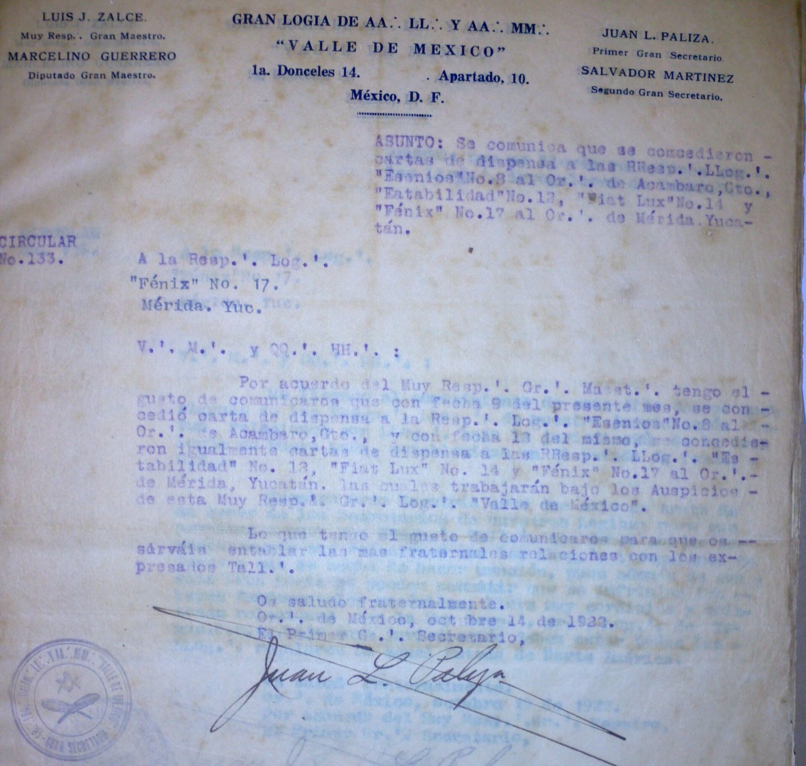 Cinco meses después, por acuerdo de 13 de octubre de 1922, dictado por el Gran Maestro de la Gran Logia de Antiguos Libres y Aceptados Masones “Valle de México”, Luis J. Zalce, se les concedieron a estas tres nuevas logias yucatecas, las correspondientes cartas dispensas que les permitió trabajar hasta la obtención de sus cartas patentes el 23 de junio de 1923.