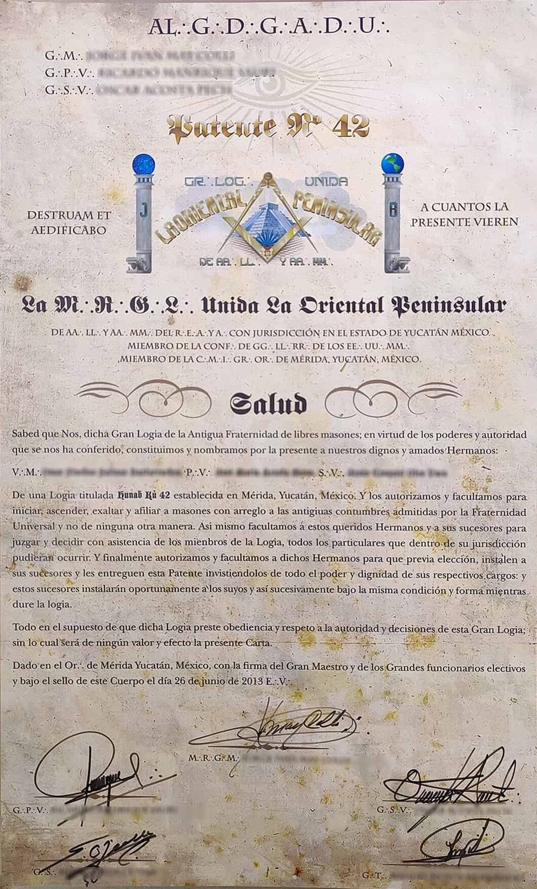 Para el día 26 de junio de 2013, con la firma del Gran Maestro y de los Grandes Funcionarios, se nos hizo entrega de la Carta Patente Número 42, que nos autorizó, facultó y constituyó como Logia Regular bajo los auspicios de la Gran Logia Unida La Oriental Peninsular de Antiguos, Libres y Aceptados Masones del Oriente de Yucatán.